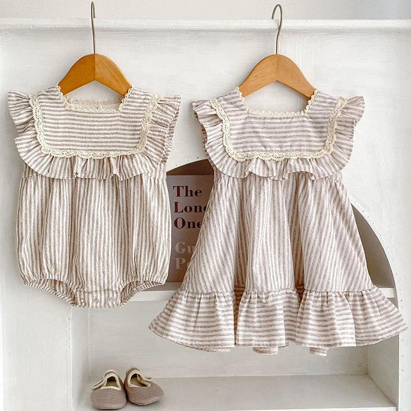 Girls Striped Lace Summer Romper Sister Matching Princess Dresses