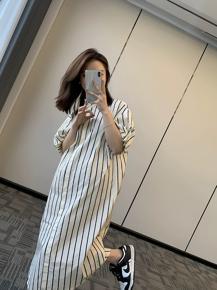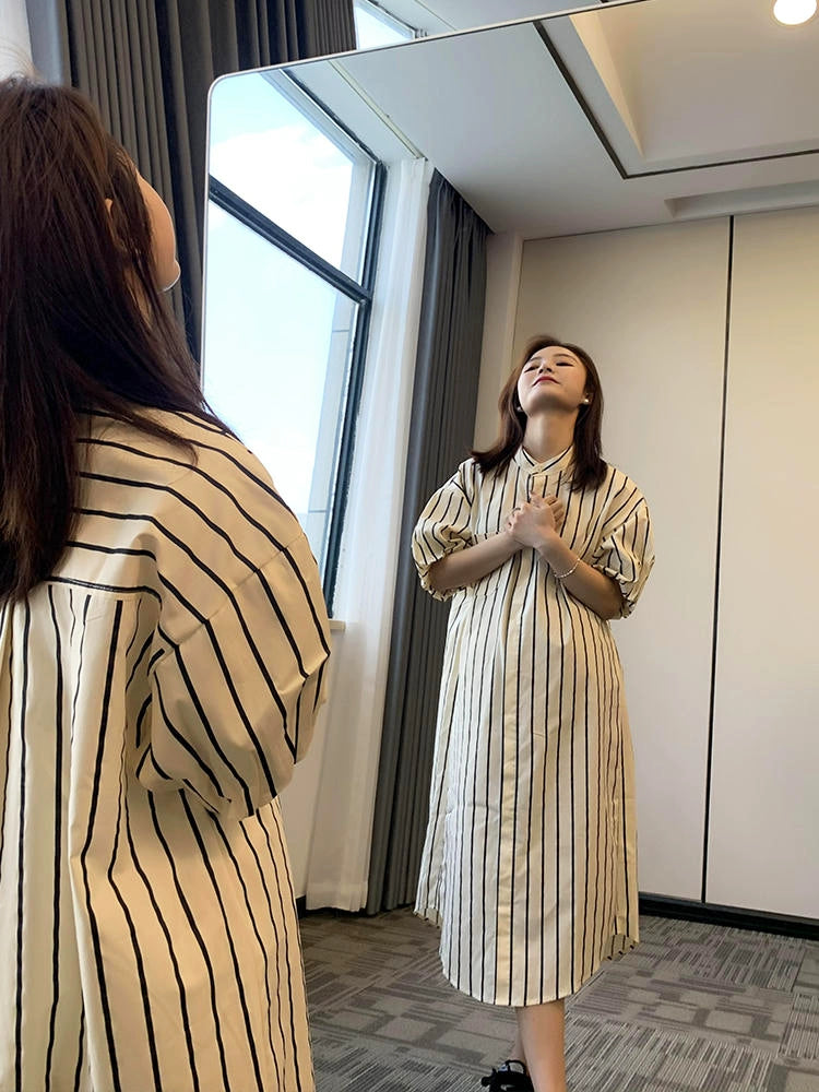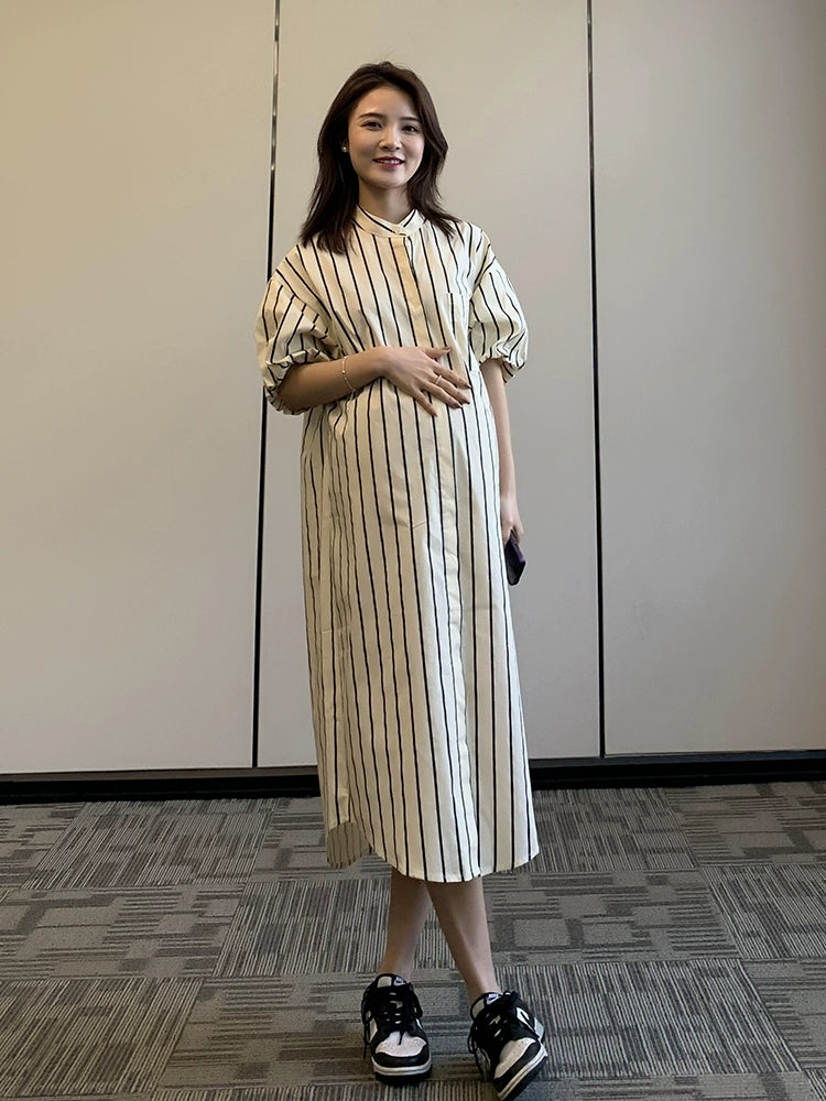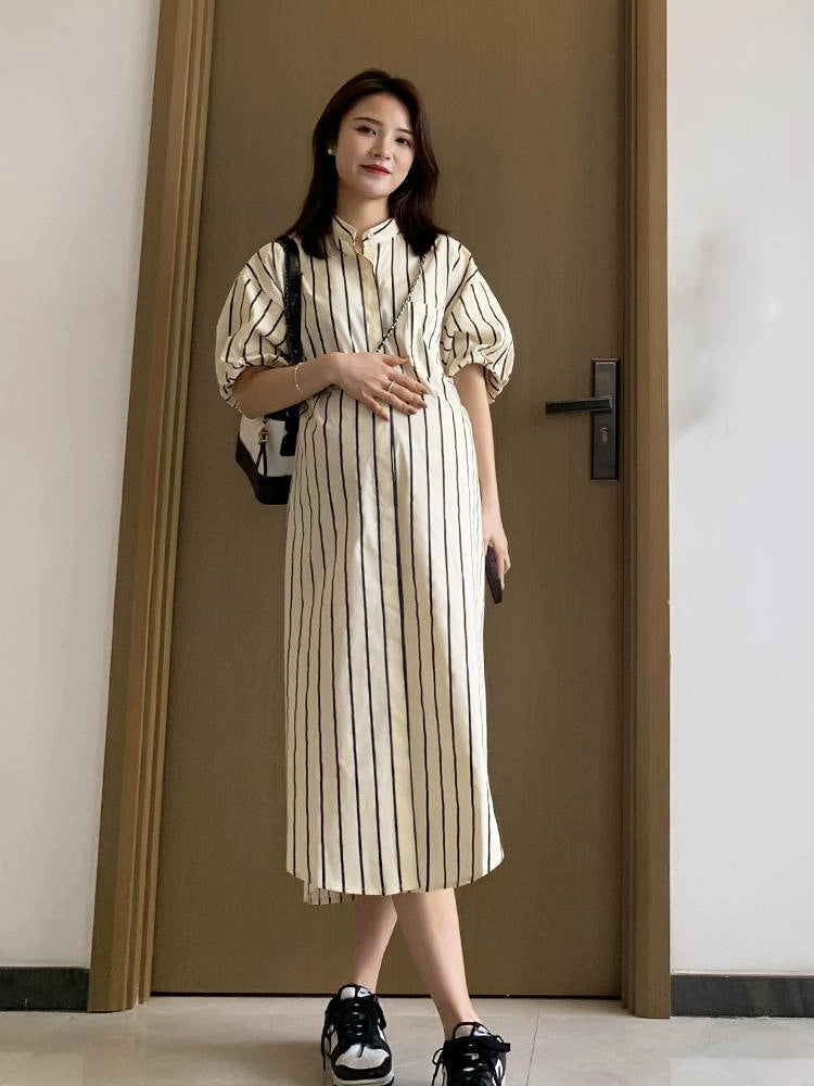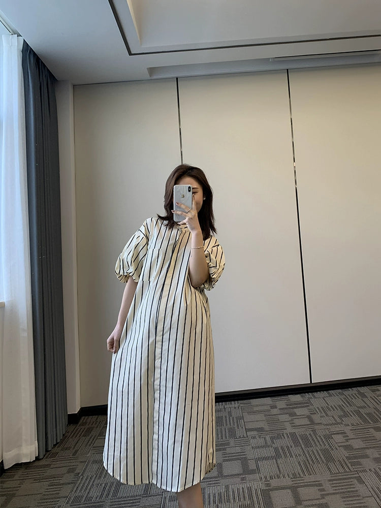 Maternity Summer Shirt For Breastfeeding Stand Collar Mid Length With Long Length Puff Sleeves Shirt Dress