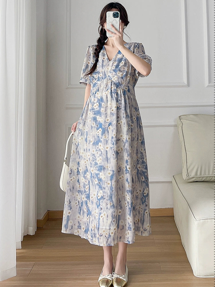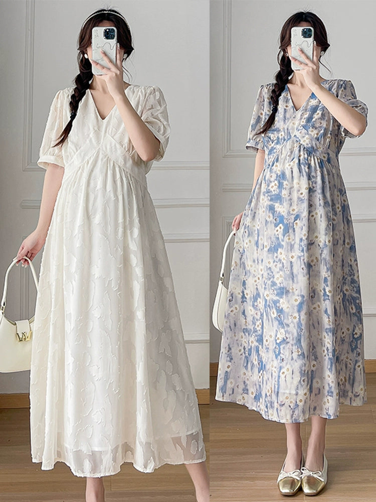 Chiffon Sweet Floral Dress With Long V Neck: Loose Maternity Summer 2024 New Arrival