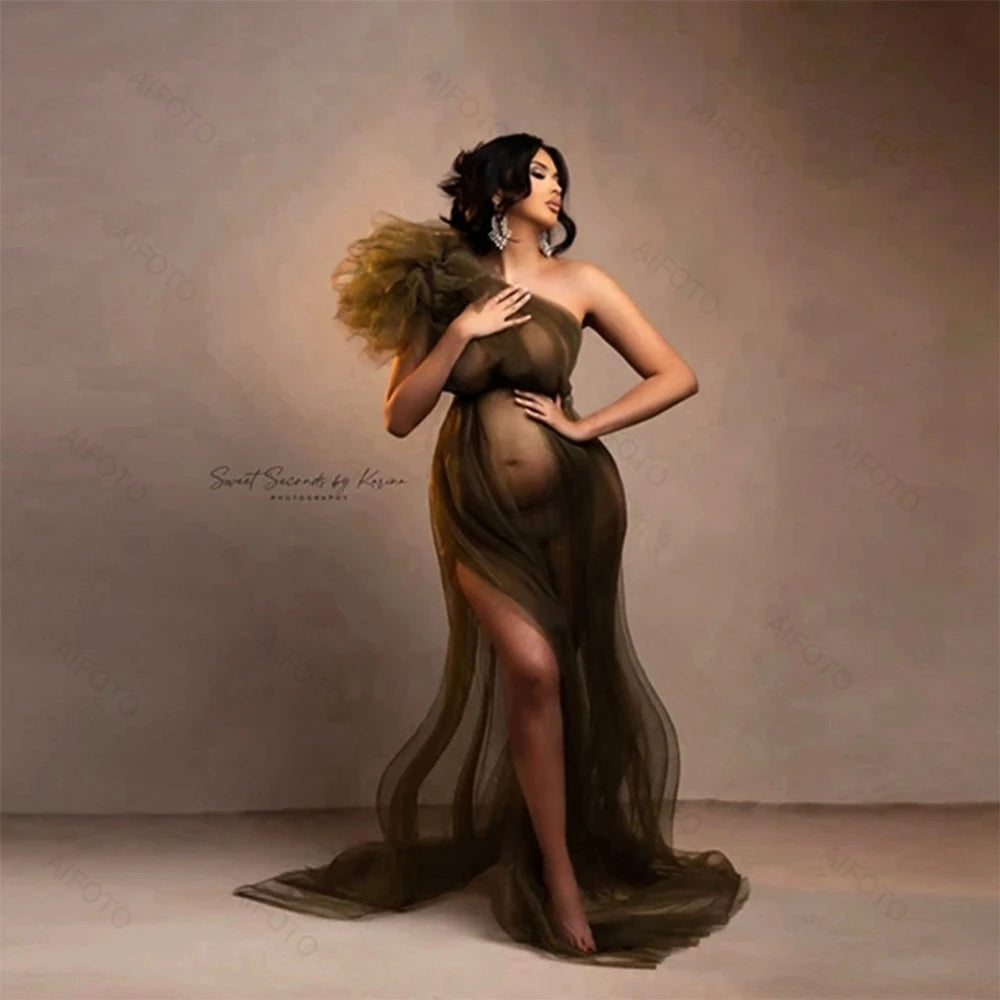 Tulle One Shoulder Sexy Maternity Dress With High Split & Long: See Thru Mesh Ruffles Gown