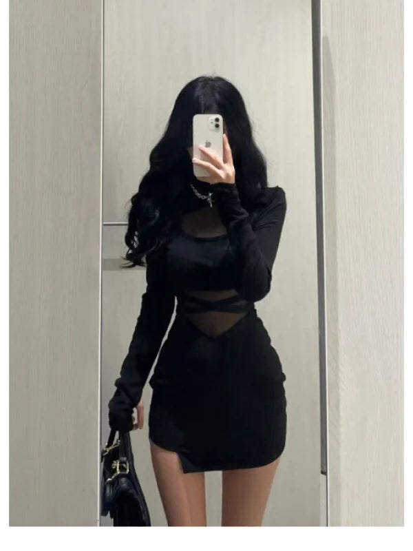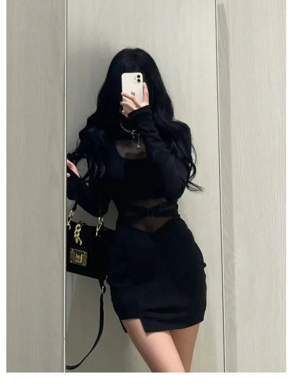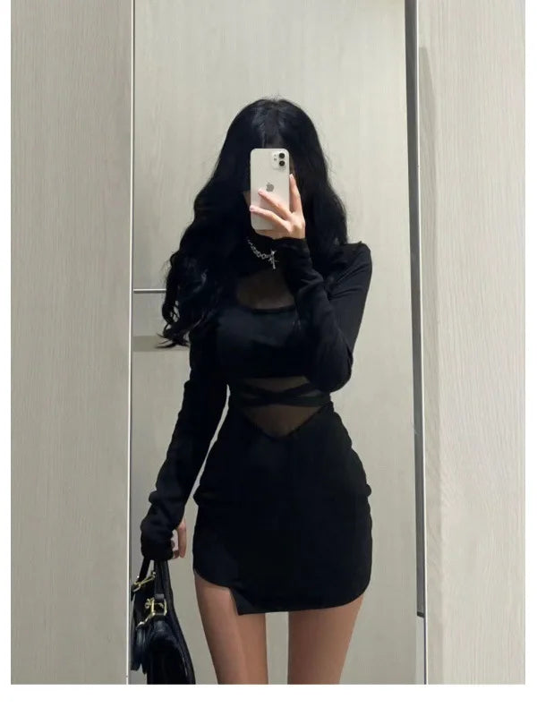 New Sexy Black Pile Up Sleeves Fishbone Dress Personalized Slim Women Dress: Thin Gauze Perspective Wrap Around Buttocks