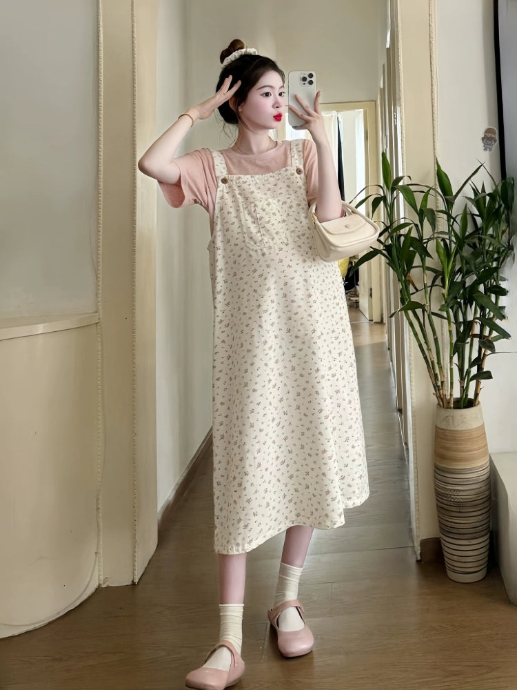 Western Style Women's Sweet Floral Maternity One Or Two-Piece Loose Suit: Suspender Dress in Plus Sizes