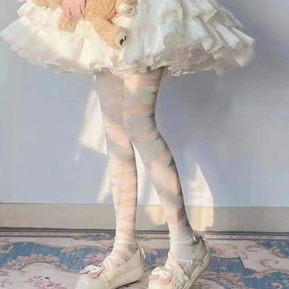 Women Girls Pantyhose See-through Cross Bandage Thin Cosplay Japanese Style Elasticity Tights Stockings Leggings